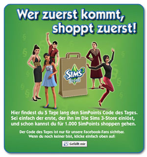 *Du musst Fan unserer Facebook-Seite sein, um den Code sehen zu können und zur Verwendung von SimPoints sind ein EA-Konto, Akzeptieren des Die Sims 3-Store-Lizenzvertrags unter http://de.store.thesims3.com/dsa.html und die Registrierung des Spiels Die Sims 3 erforderlich.